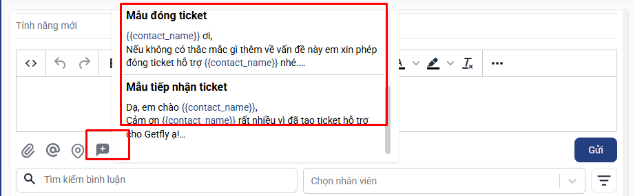 Khi xử lý ticket, nhân viên chỉ cần chọn mẫu trả lời nhanh tương ứng, hệ thống sẽ tự động chèn nội dung vào khung phản hồi.
