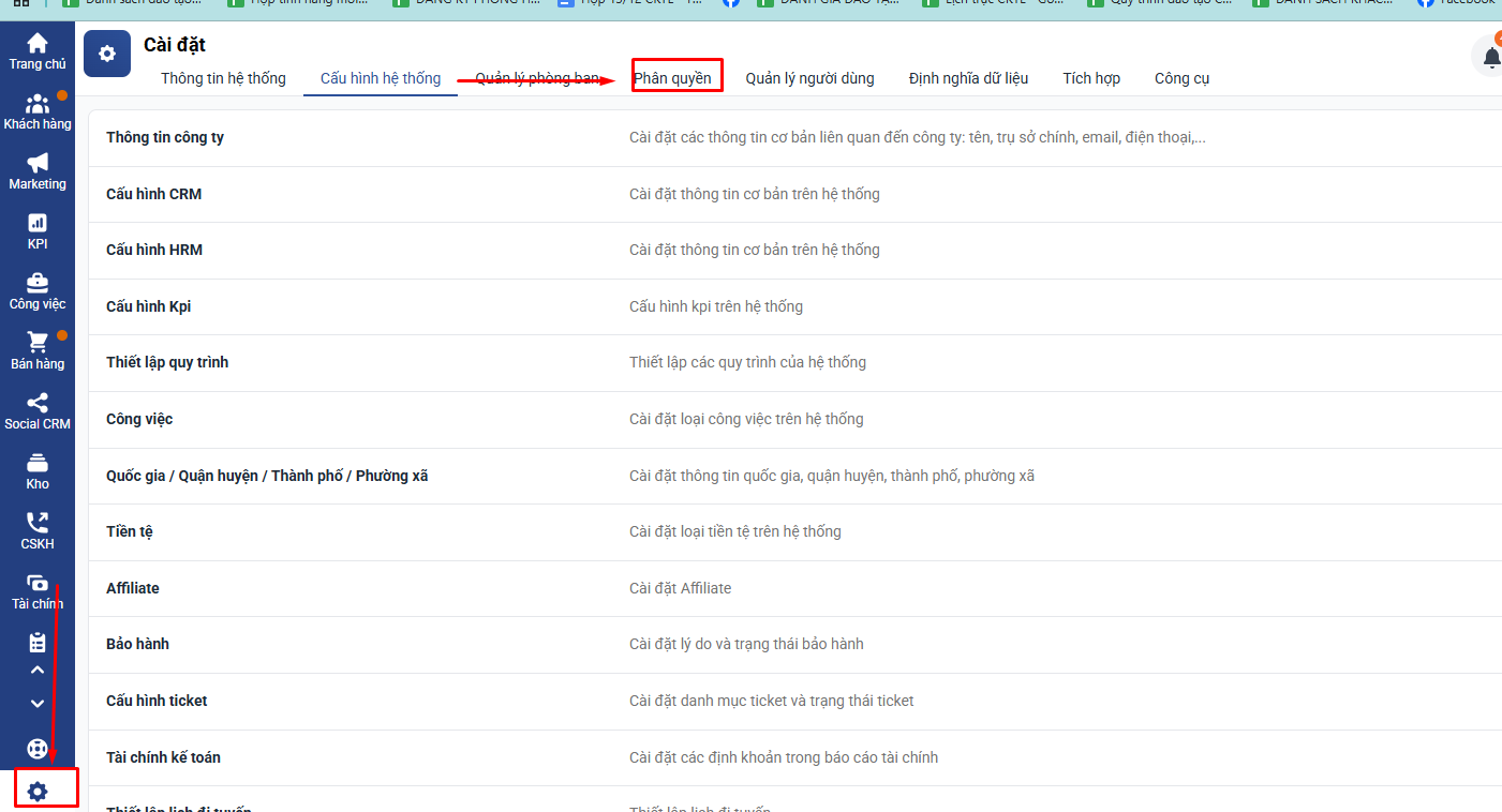 Bước 4: Tại bảng chi tiết phân quyền hiển thị, tìm đến mục Quyền hợp đồng.