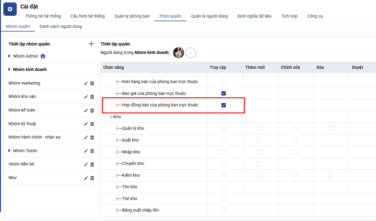 Bước 5: Tích chọn quyền “Truy cập hợp đồng của phòng ban trực thuộc”.