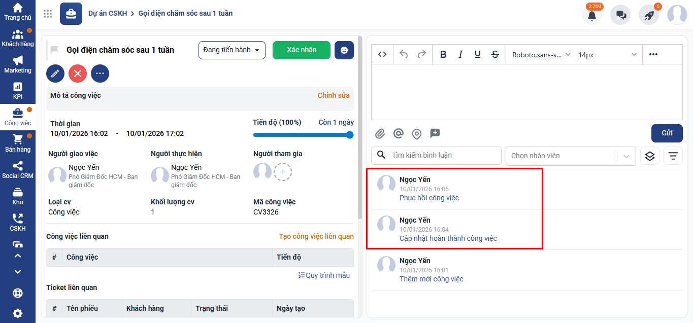 - Trạng thái công việc sẽ quay về Đang tiến hành.