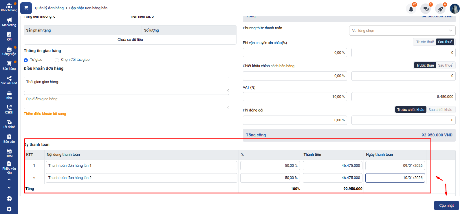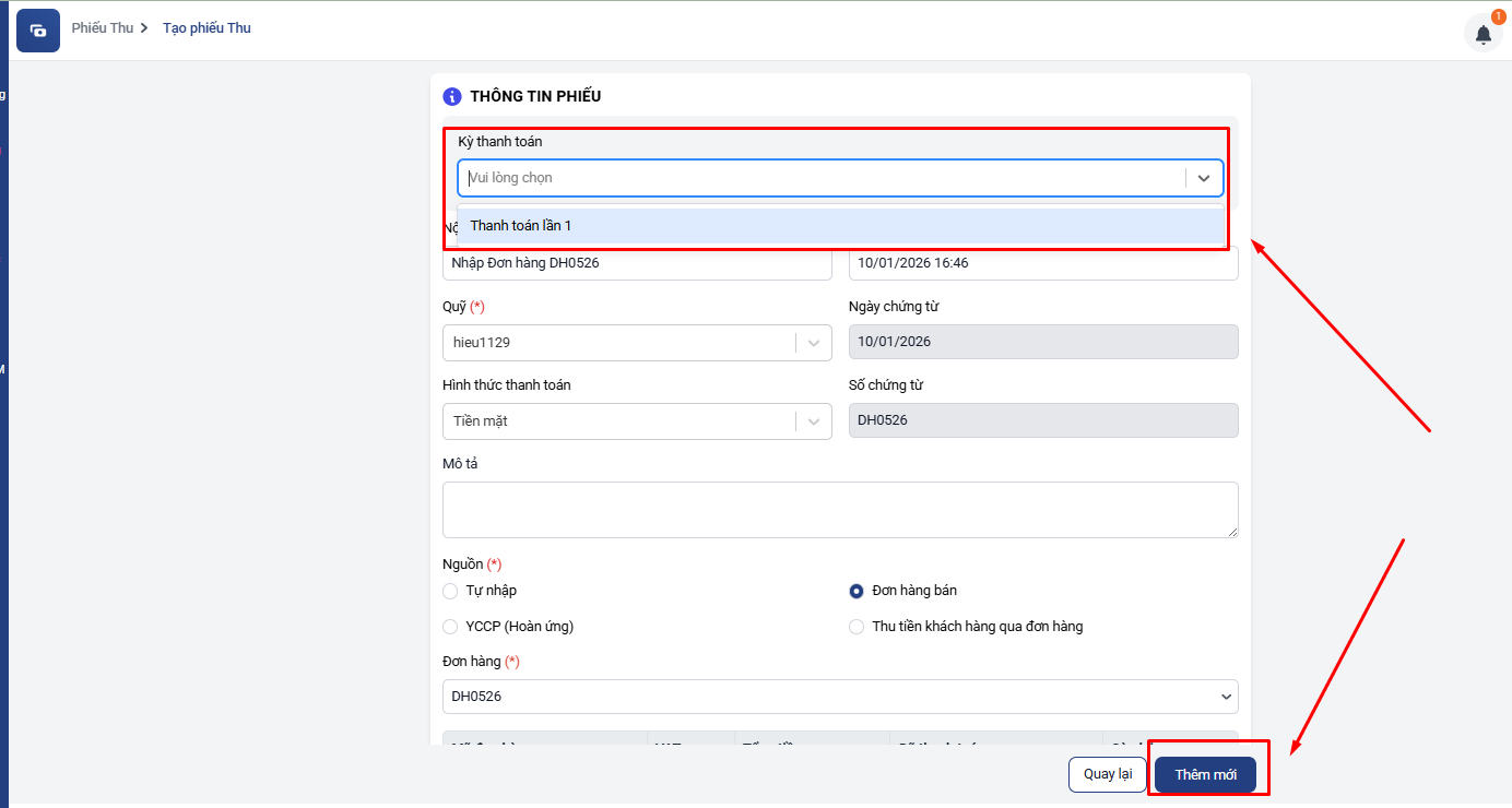 - Người dùng tạo Kỳ thanh toán trong đơn hàng theo giá trị và thời điểm cần thu khi tạo đơn hàng