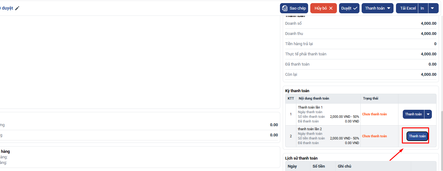 - Giá trị của kỳ thanh toán sẽ được ghi nhận vào cột Đã thanh toán của đơn hàng