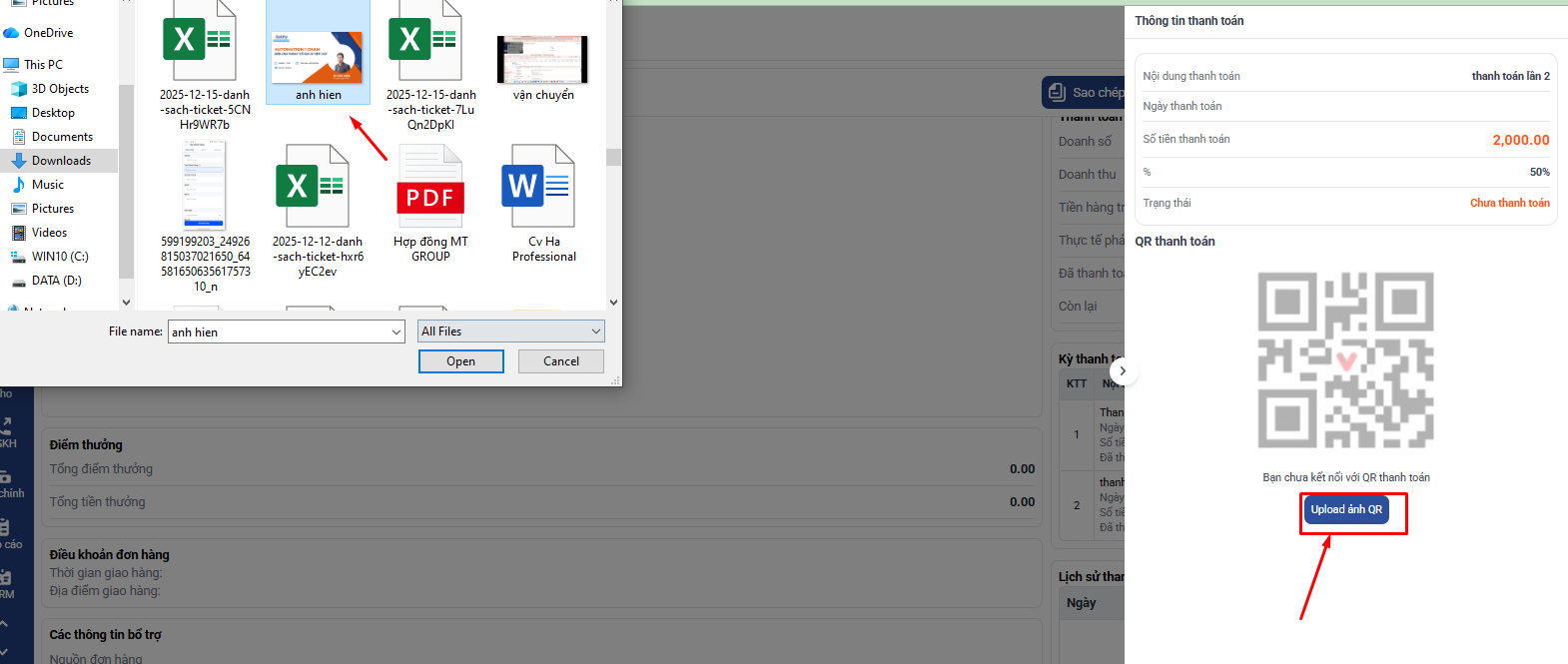 - Tại kỳ thanh toán trong chi tiết đơn hàng này, người dùng tải ảnh minh chứng thanh toán: