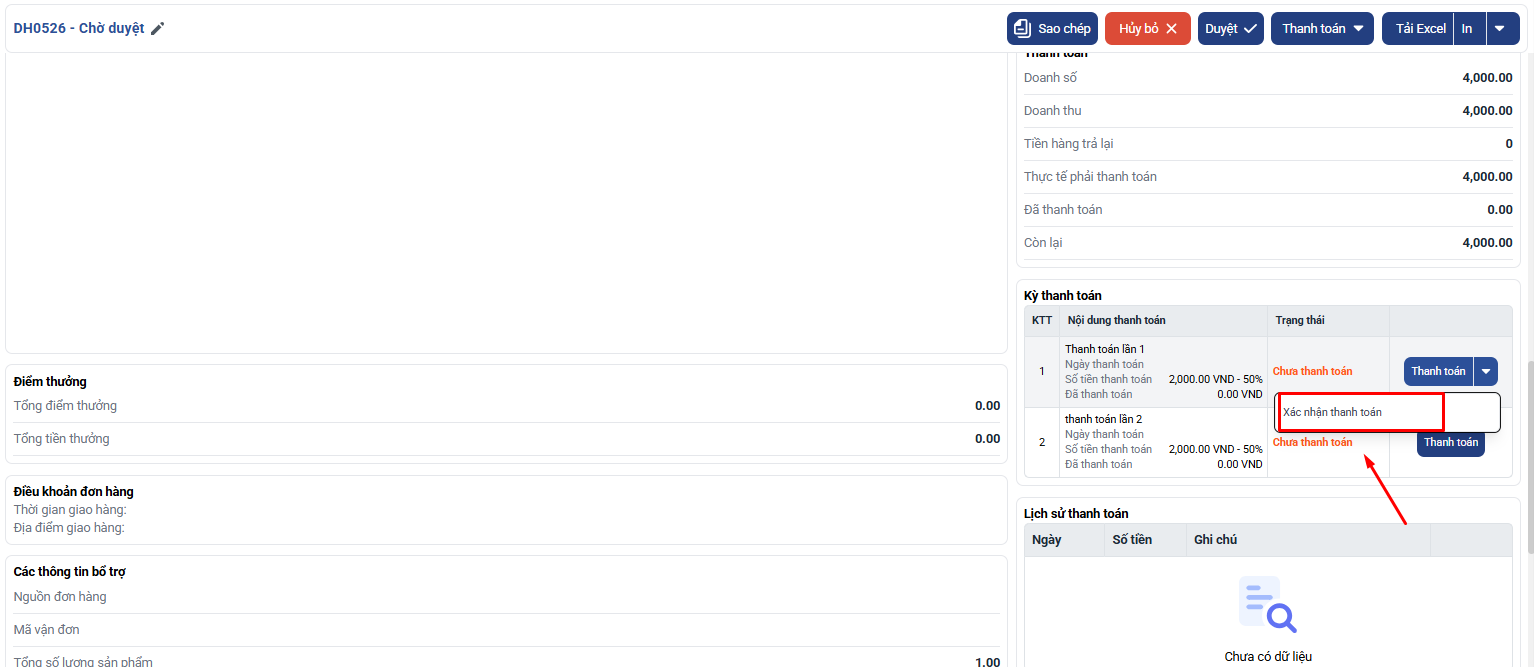 - Chỉ user có quyền Thanh toán trong bảng phân quyền mới có thể thực hiện xác nhận thanh toán tại kỳ thanh toán, không bắt buộc là người tạo hay xử lý đơn hàng