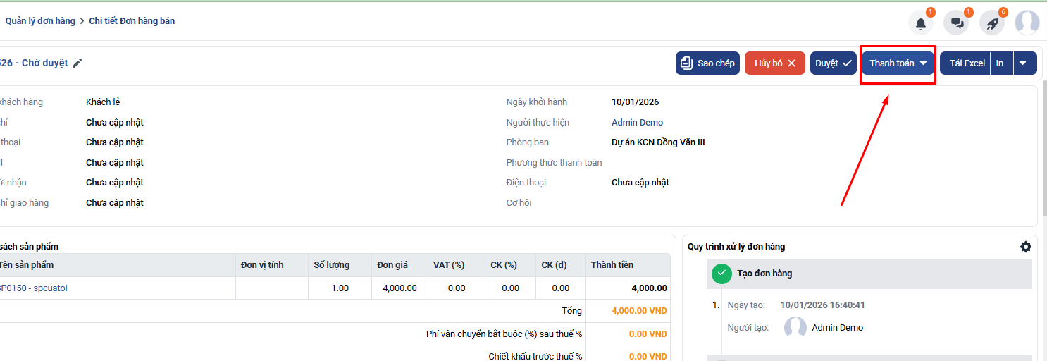 - Trong quá trình xử lý đơn hàng, không phải doanh nghiệp nào cũng sử dụng VietQR để ghi nhận thanh toán tự động. Nhiều trường hợp khách hàng thanh toán bằng chuyển khoản thường, tiền mặt hoặc hình thức khác, và kế toán cần có cách ghi nhận linh hoạt nhưng vẫn đảm bảo theo dõi được số tiền đã thanh toán, công nợ và lịch sử thu tiền.