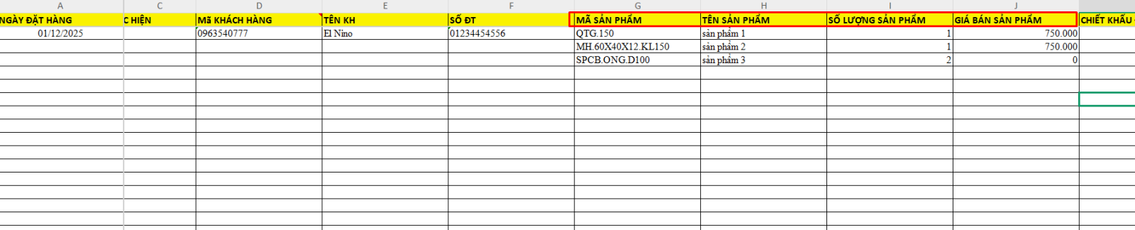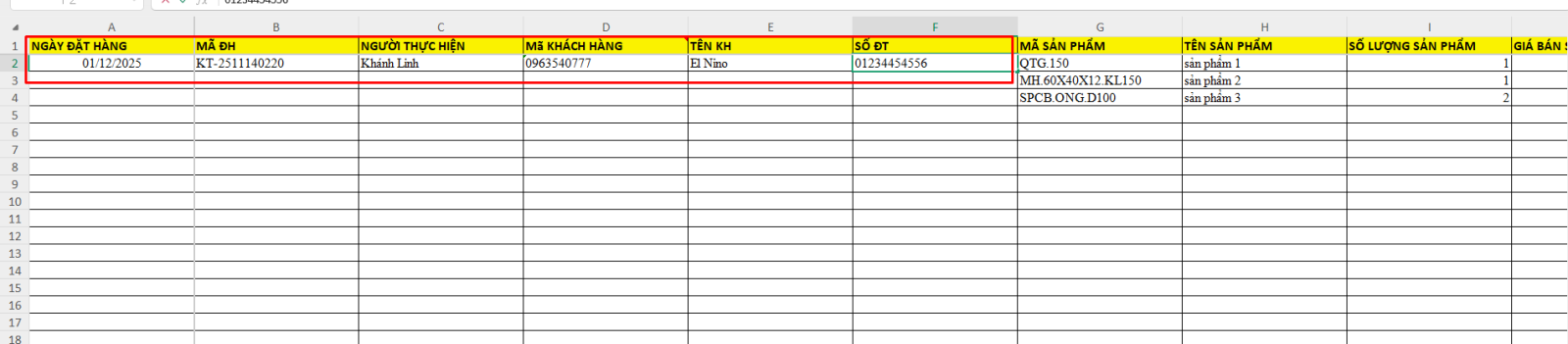 - Các dòng sản phẩm tiếp theo không cần nhập lại thông tin đơn hàng.