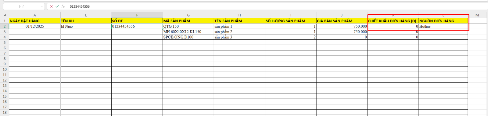 Các thông tin chung của đơn hàng chỉ cần ghi 1 lần, tại dòng đầu tiên của đơn hàng, bao gồm: