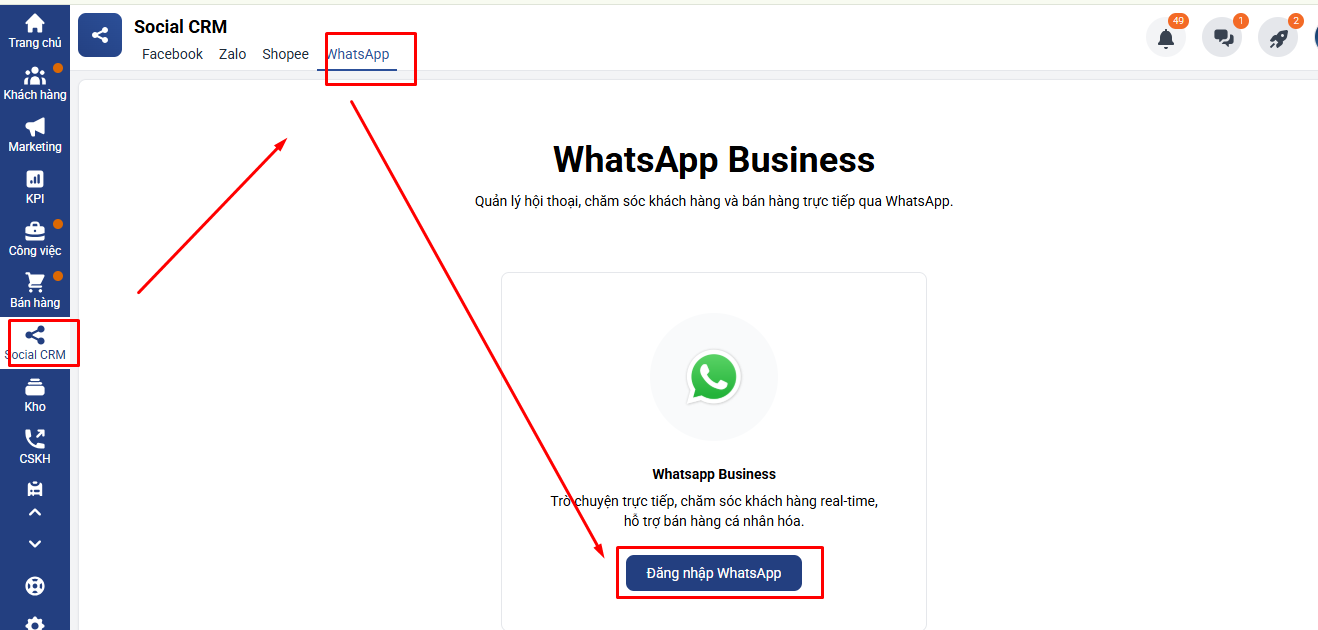 Khách hàng quản lý trang WhatsApp truy cập vào Social CRM – WhatsApp và bấm → Đăng nhập WhatsApp