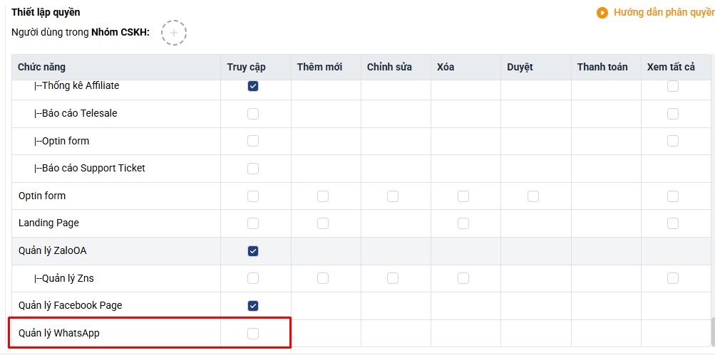 - Người dùng có quyền phân quyền “Quản lý WhatsApp” trong hệ thống CRM.