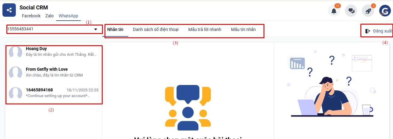 (3) Các tab chức năng chính bao gồm: Nhắn tin, Danh sách số điện thoại, Mẫu trả lời nhanh, Mẫu tin nhắn