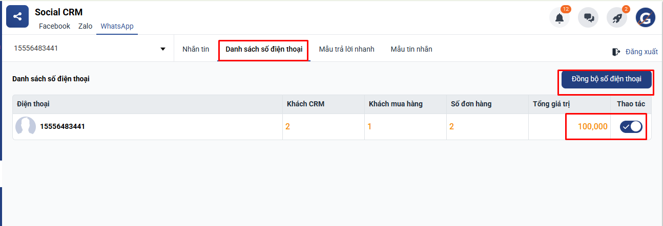 - Khi có số điện thoại WhatsApp mới thì sử dụng nút Đồng bộ số điện thoại để cập nhật thông tin.