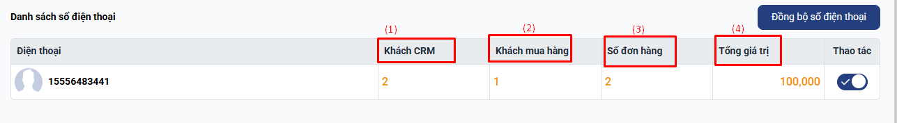 + Giải thích các thông số quản lý ở màn hình Danh sách số điện thoại