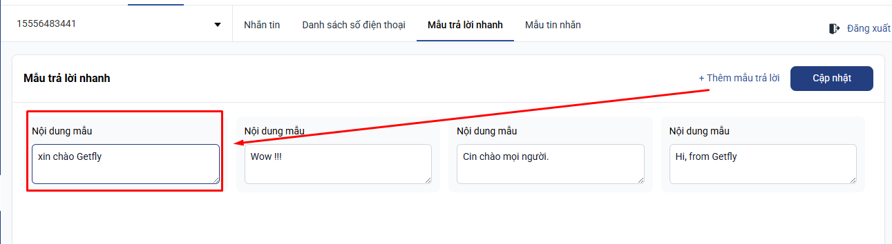 + Quay lại màn hình mẫu trả lời nhanh → Sửa lại nội dung câu trả lời → Ấn cập nhật để lưu lại
