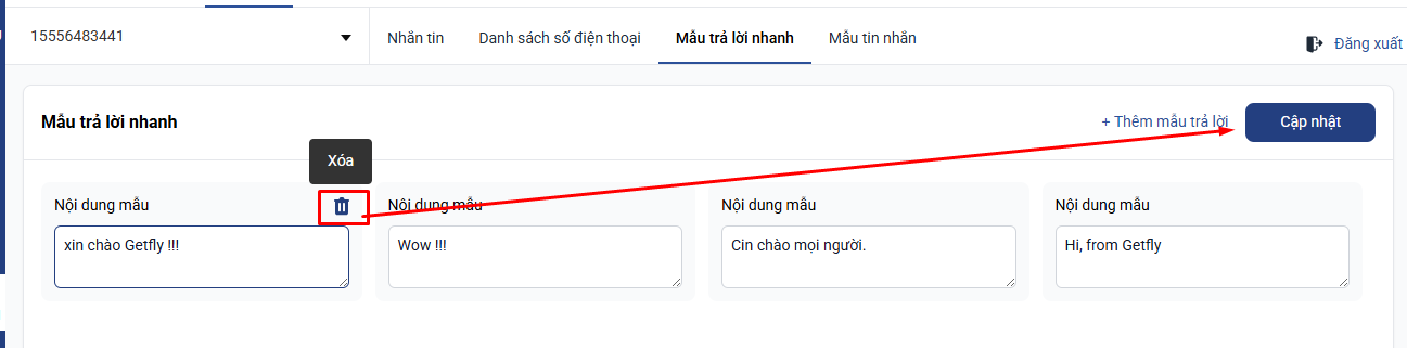 - Mẫu tin nhắn nhanh sau khi thêm mới, xóa thì cần bấm cập nhật để ghi nhận