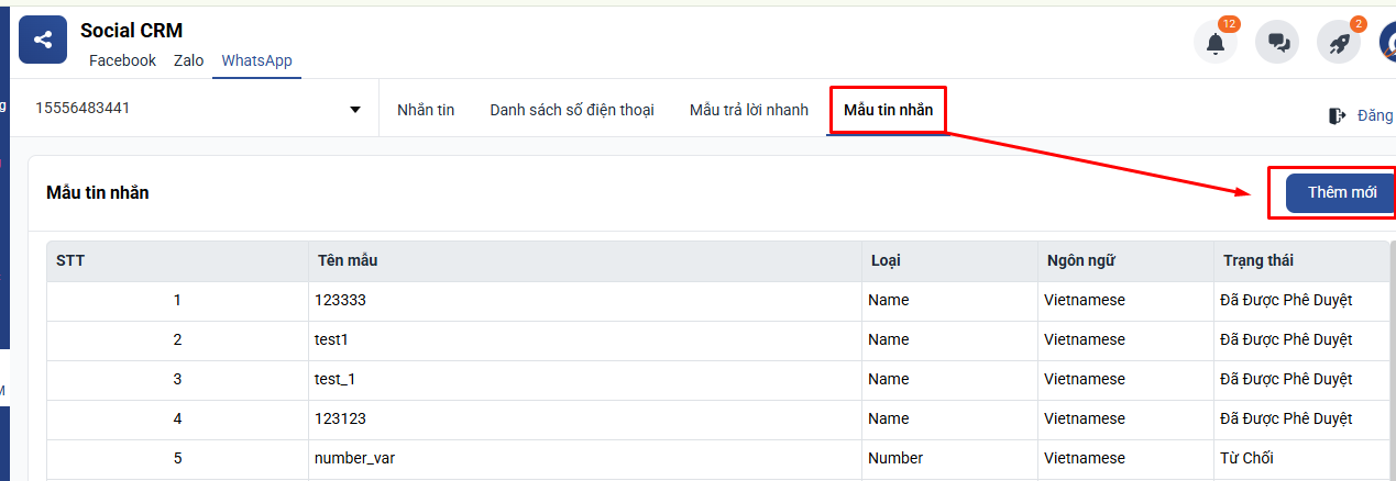 - Bước 3: Sau khi điền đủ thông tin, bấm Thêm mới. Sau đó sẽ là thời gian đợi WhatsApp duyệt mẫu tin nhắn này. Mẫu phải được duyệt thì mới sử dụng được.