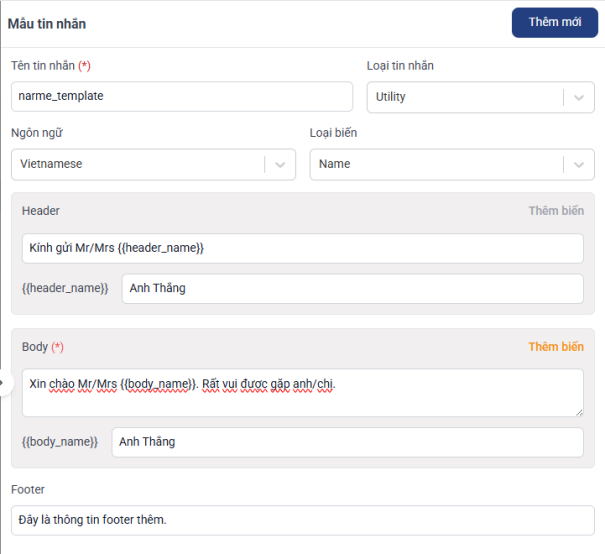 + Header: Nhập thông header của tin nhắn (Khi bấm thêm biến thì cần nhập thêm ví dụ cho biến đó)
