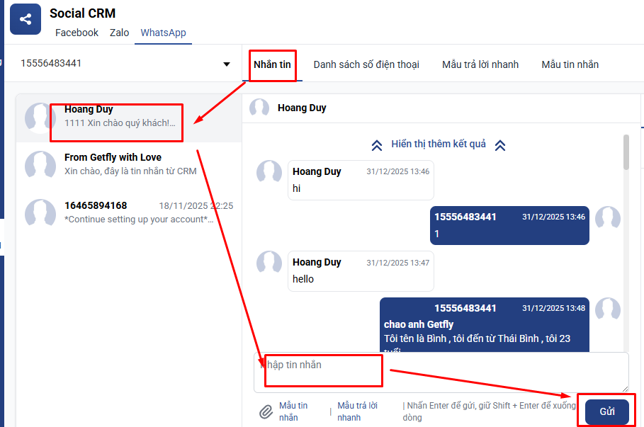 Lưu ý là người dùng GetflyCRM không chủ động nhắn tin cho khách hàng được. Thay vào đó, khách hàng nhắn tin đến số điện thoại của WhatsApp và sau đó người dùng GetflyCRM sẽ nhận và nhắn tin tiếp với khách hàng.