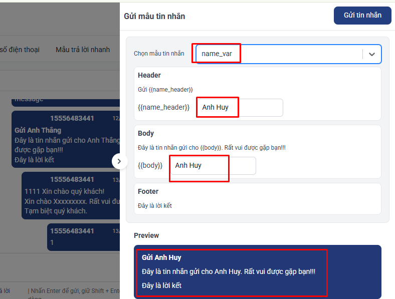 - Khi chọn một mẫu có biến, các bạn có thể điền nội dung tương ứng vào biến. Tin nhắn thực thế sẽ được hiển thị ở preview.