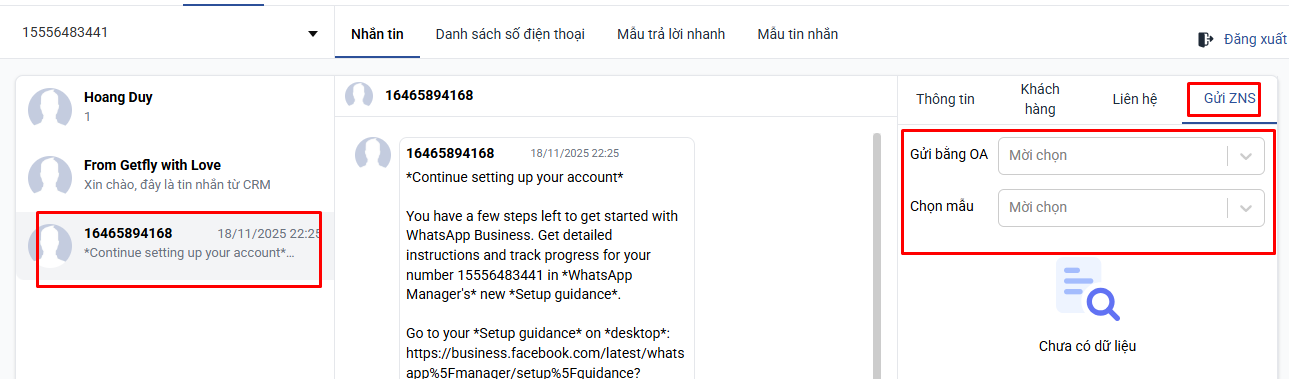 Các bạn có thể gửi trực tiếp ZNS cho số điện thoại đăng ký WhatsApp của khách hàng.