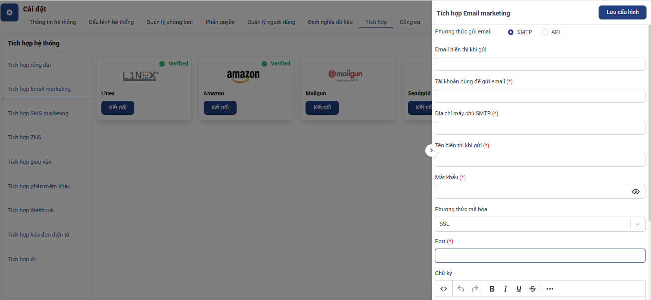 Các bạn vào Cài đặt → Tích hợp → Tích hợp email marketing → chọn Mail Linex → Ấn kết nối