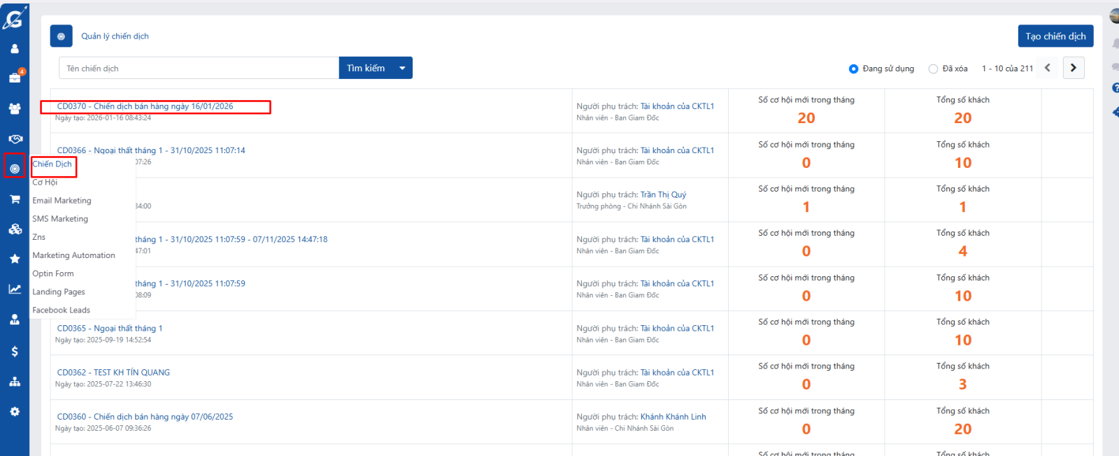Bước 1: Truy cập vào chiến dịch cần phân chia cơ hội.