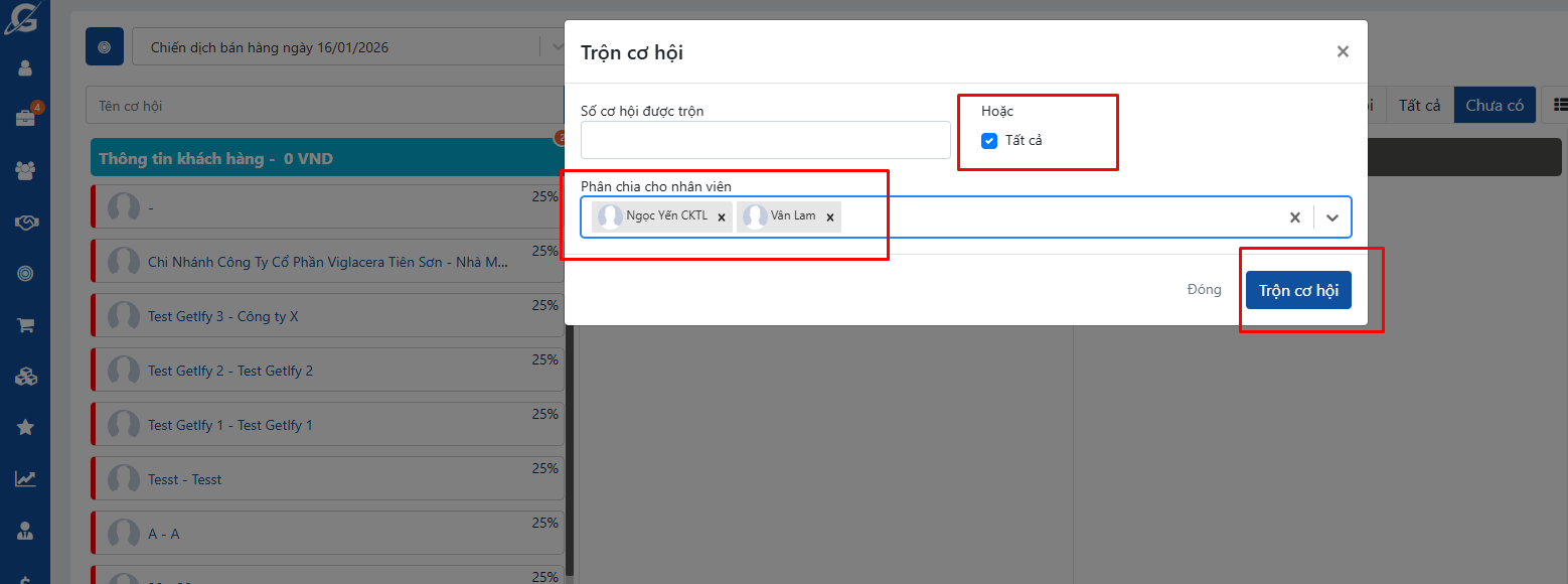 Bước 3: Chọn Tất cả cơ hội trộn.Tại phần phân chia cho nhân viên, chọn các nhân viên mà bạn muốn chia đều cơ hội. Nhấn trộn cơ hội để hệ thống thực hiện phân chia.