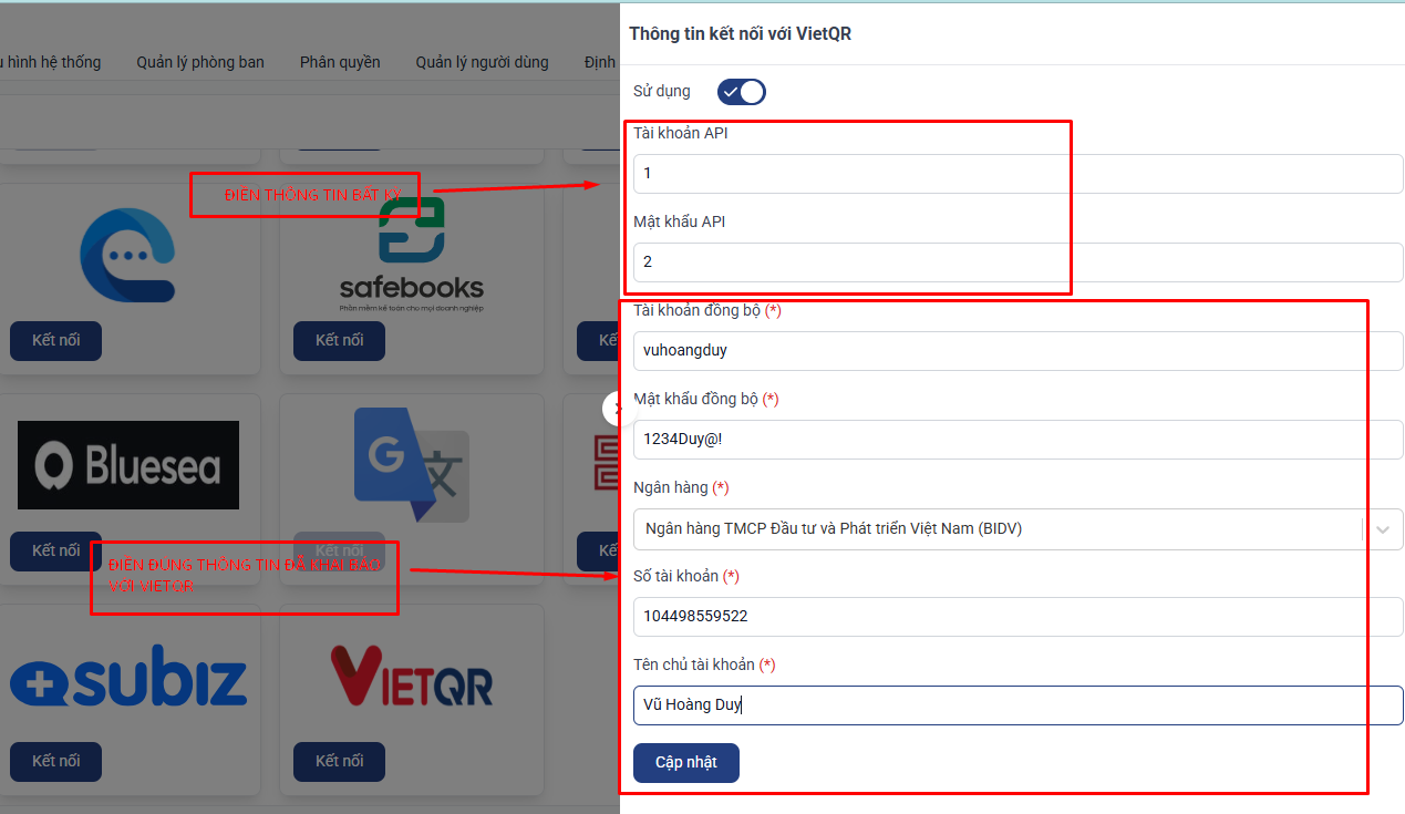 Sau khi VietQR cung cấp: Tài khoản API và Mật khẩu API chính thức