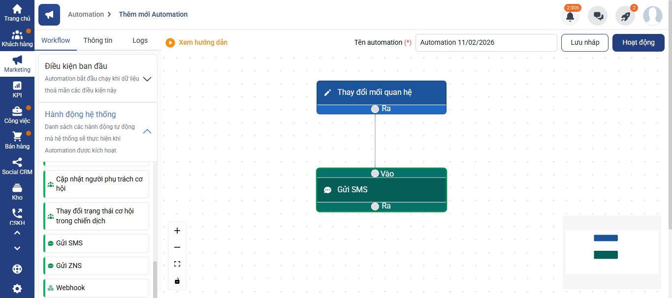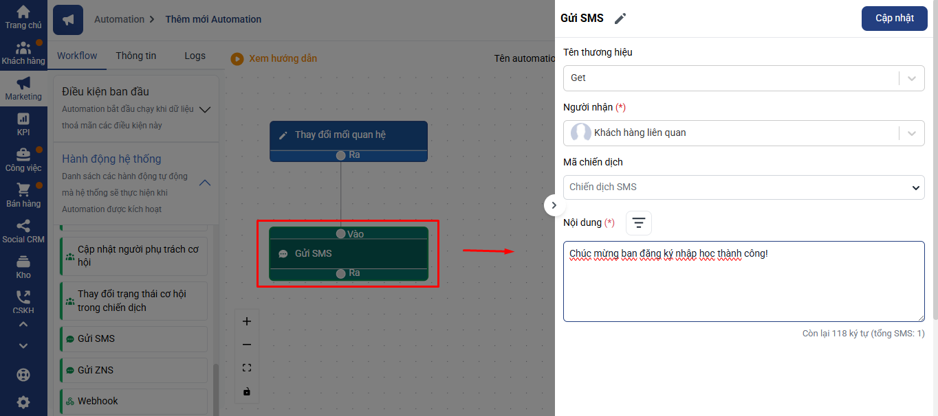 - Tự động gửi SMS khi khách hàng được chuyển từ mối quan hệ này sang mối quan hệ khác
