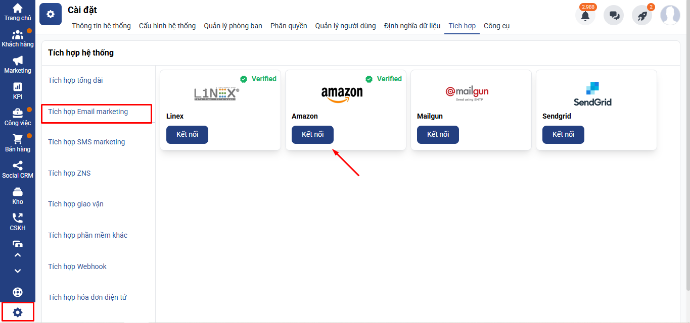 - Nhấn Kết nối tại một logo email bất kỳ (Linex, Amazon,…)