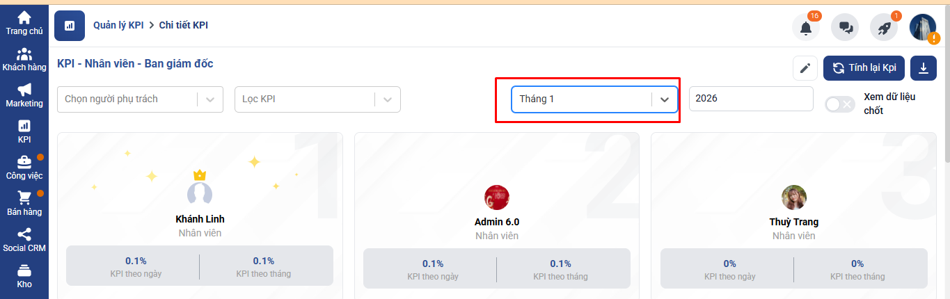Bước 3: Nhấn Tính lại KPI để hệ thống cập nhật lại toàn bộ số liệu.
