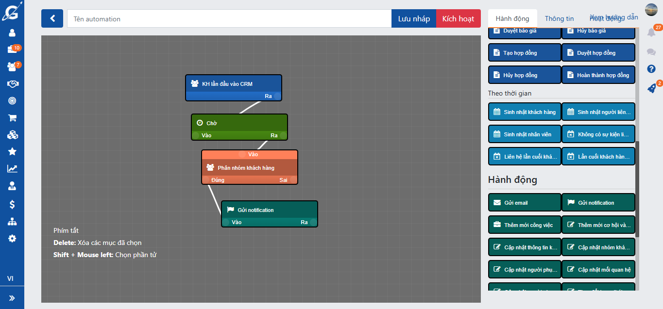 - Chọn hành động KH lần đầu vào CRM, khối chờ, phân nhóm khách hàng và hệ quả Gửi notification