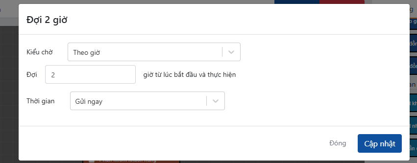 - Thời gian chờ: chọn chờ 2 giờ hoặc tùy vào thời gian mong muốn gửi thông báo của bạn