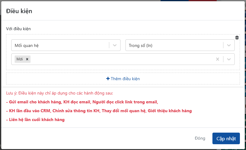 - Phân nhóm khách hàng: chọn điều kiện mối quan hệ giống với điều kiện KH lần đầu vào CRM (tức là sau khoảng thời gian chờ hệ thống sẽ check vẫn ở mối quan hệ mới tương ứng này hệ thống sẽ gửi thông báo)