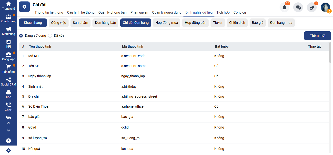 Bước 1: Truy cập vào Cài đặt → Định nghĩa dữ liệu → chọn Khách hàng (bạn có thể chọn định nghĩa dữ liệu Đơn hàng, Hợp đồng,… tùy theo nhu cầu)