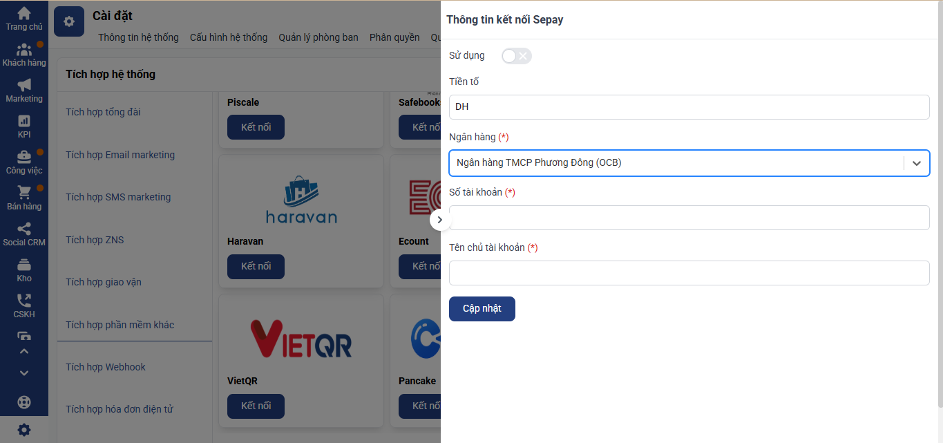 - Tiền tố: nhập trùng khớp với tiền tố đã cài đặt bên Sepay nếu không sẽ không đổ được dữ liệu về CRM