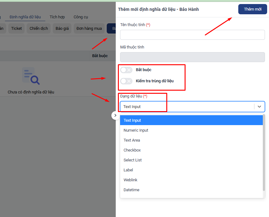 - Thêm mới: Tạo các trường thông tin (dạng chữ, số, ngày tháng, hoặc danh sách chọn).