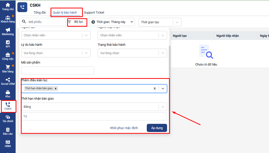 - Sử dụng bộ lọc tại danh sách Phiếu bảo hành.