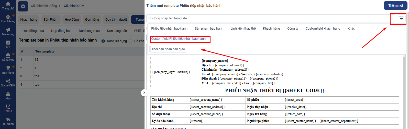 - Vào phần Cài đặt → Cấu hình CRM → Template bản in → Phiếu tiếp nhận bảo hành → Chọn mẫu template bản in cần điều chỉnh