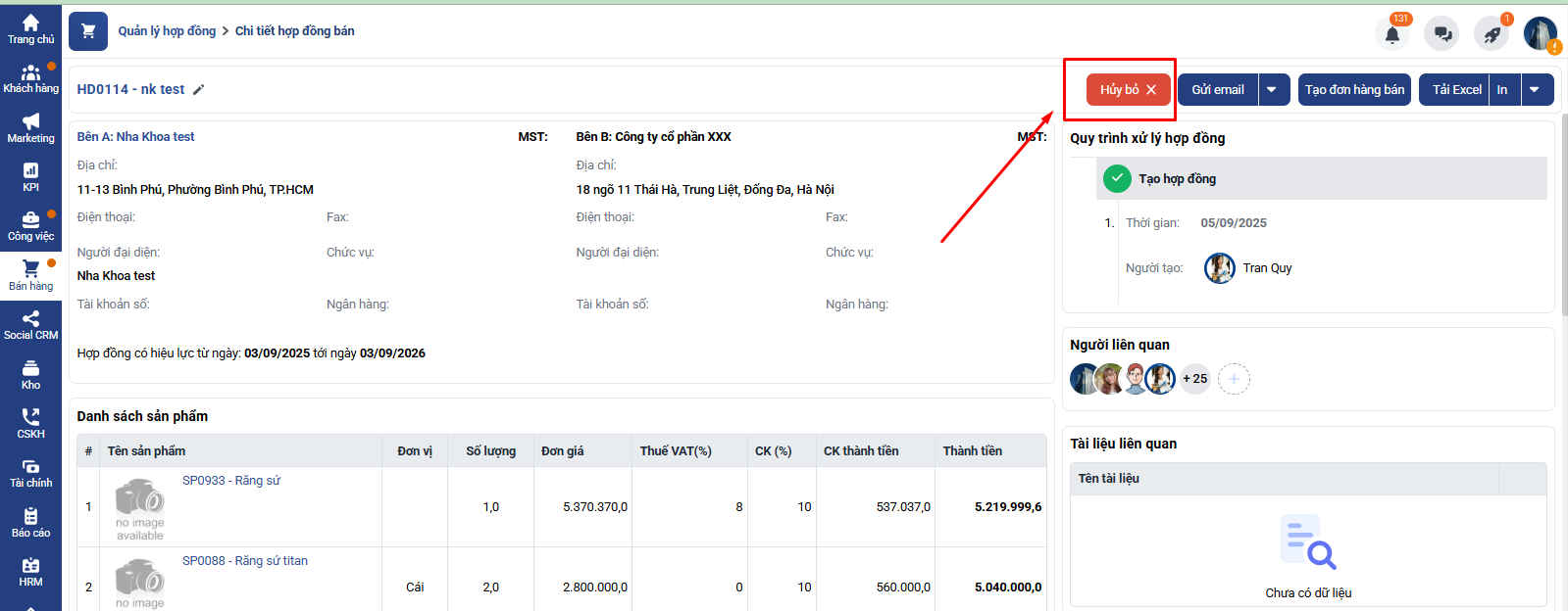 Cách 1: Tại danh sách, vào chi tiết hợp đồng bạn muốn Hủy → Click nút Hủy bỏ