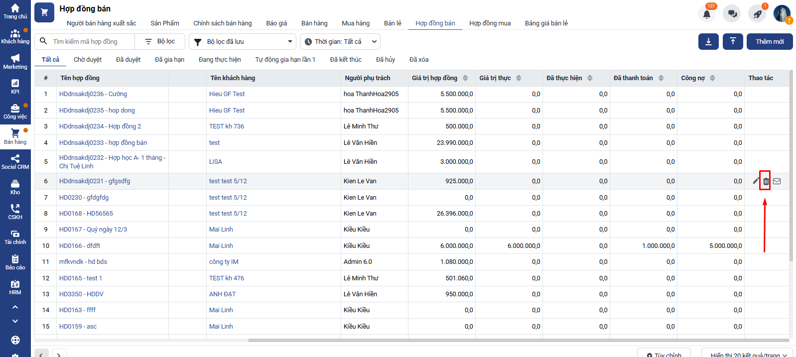 Cách 2: Xóa tại màn hình danh sách hợp đồng → Cột thao tác cuối bảng → Click biểu tượng Xóa