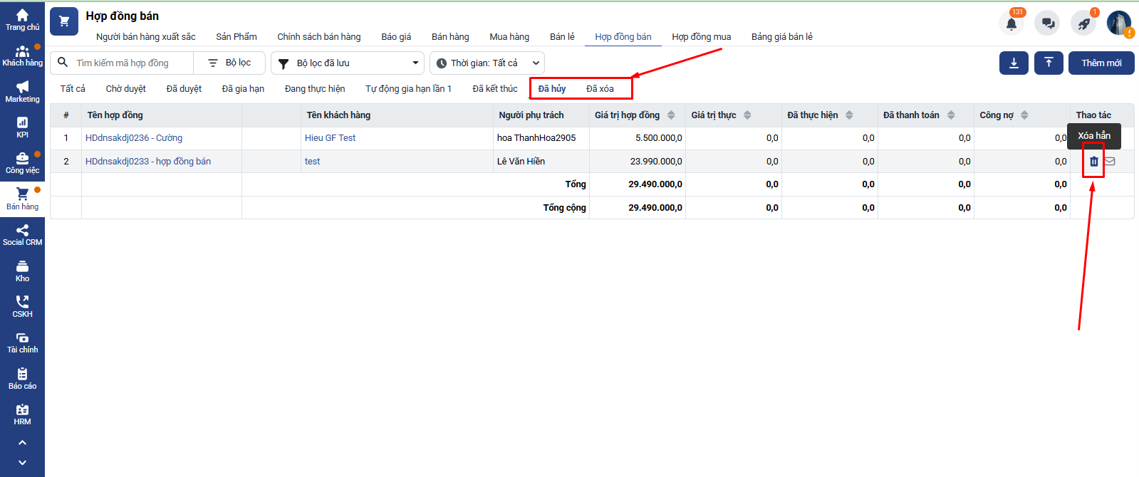 Vào tab Đã hủy/ Đã xóa → Click biểu tượng xóa hẳn để xóa hẳn hợp đồng